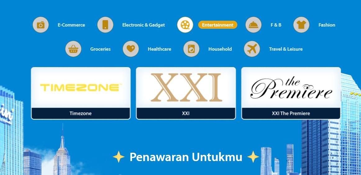 Selain berbelanja dan perangkat elektronik, Bank Mandiri juga menawarkan penawaran menarik dalam kategori hiburan. Kamu dapat memperoleh diskon menarik dari XXI, Timezone, dan The Premiere XXI.